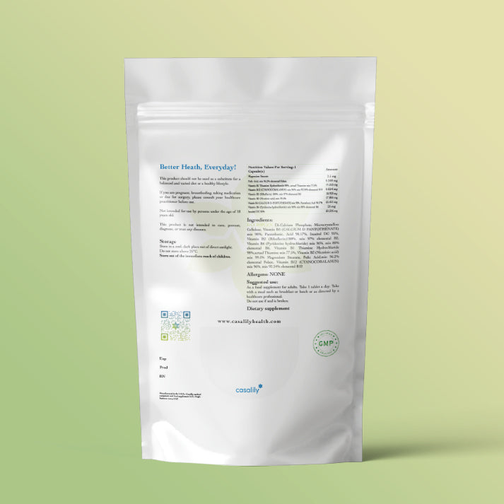 Stay energized and focused with our B-Complex supplement, featuring a blend of essential B vitamins designed to support your overall wellness. Each capsule delivers key nutrients to help maintain energy, promote a balanced mood, and support your skin and hair health—all while complementing your active lifestyle.